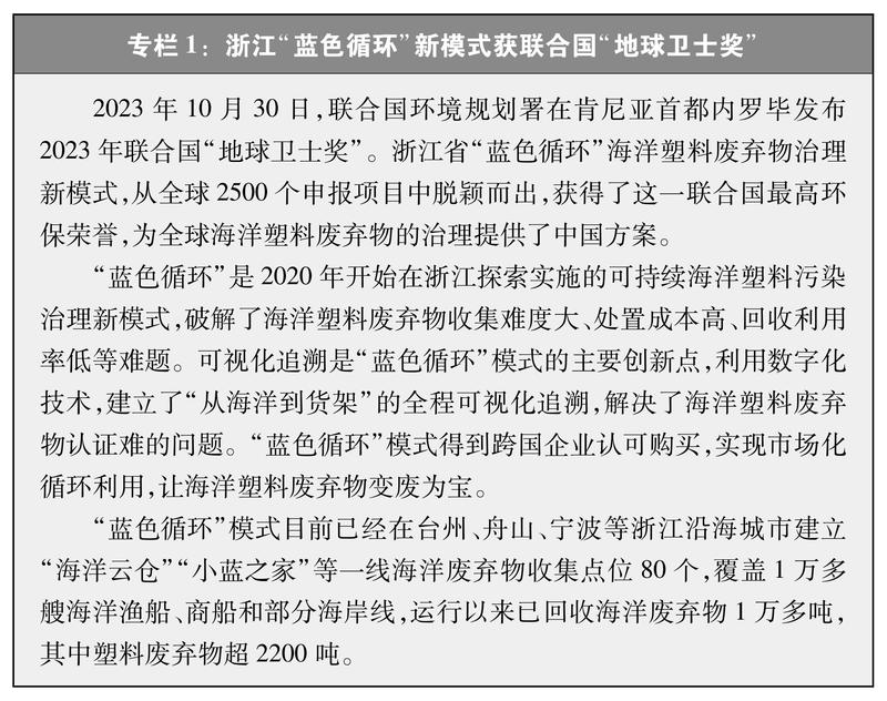 清理整治海洋垃圾。出台《关于进一步加强塑料污染治理的意见》《“十四五”塑料污染治理行动方案》,从源头管住垃圾入海。进一步建立实施海洋垃圾监测、拦截、收集、打捞、运输、处理体系,各沿海城市通过“海上环卫”等制度常态化开展重点海域入海河流和近岸海域垃圾入海防控与清理整治,浙江省“蓝色循环”海洋塑料废弃物治理新模式获得联合国“地球卫士奖”。推进江河湖海垃圾联防联治,2022年在胶州湾等11个重点海湾开展专项清漂行动,出动18.81万人次,清理各类岸滩和海漂垃圾约5.53万吨。巩固提升专项清漂工作成效,2024年将重点海湾清漂专项行动升级为沿海城市海洋垃圾清理行动。持续组织开展海洋垃圾和微塑料监测调查,与近年来国际同类调查结果相比,中国近岸海域海洋垃圾和近海微塑料的平均密度处于中低水平。