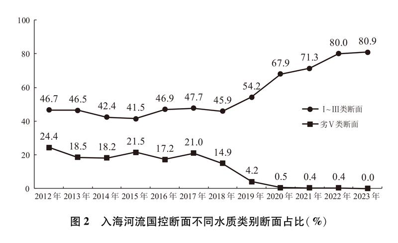 抓好入海河流污染防治。入海河流是陆源污染物输入海洋的最重要途径。中国积极提升城镇污水处理质效,建设改造雨污分流管网,加强污水处理行业监管,降低城镇生产生活污水对入海河流水质影响。2012年以来,沿海地区污水处理基础设施建设显著提速,地级以上城市污水处理厂基本完成一级A提标改造。开展农村环境整治,“十四五”以来,沿海省份新增完成1.7万个行政村环境综合整治,编制完成170个畜牧大县畜禽养殖污染防治规划,农村生活污水治理率超过45%,大幅降低农业农村污水排放。着力破解流域氮排放过量的近岸海域水质污染和富营养化问题,建立沿海、流域、海域协同一体的综合治理体系,探索将总氮控制范围向入海河流上游拓展,推动入海河流实施“一河一策”总氮治理。2012—2017年中国入海河流国控断面水质整体保持稳定并有所好转,2018年以后水质整体大幅好转。目前,入海河流国控断面水质优良(Ⅰ~Ⅲ类)断面数量约占整体的五分之四左右,丧失使用功能(劣Ⅴ类)断面基本消除。